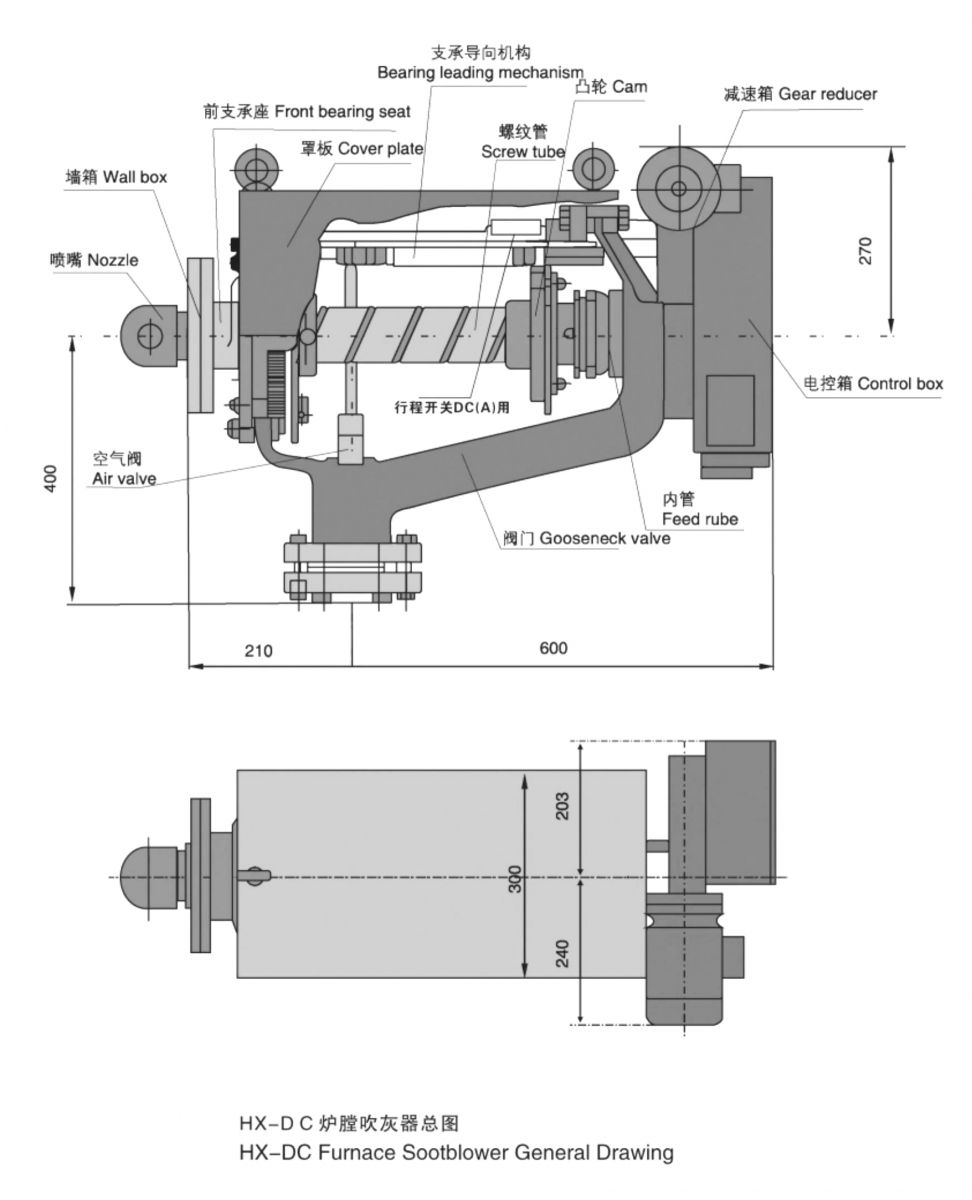 HX-DC 爐膛吹灰器主要用于吹掃鍋爐爐膛部位水冷壁上的積灰、結(jié)焦。其特點(diǎn)如下:
